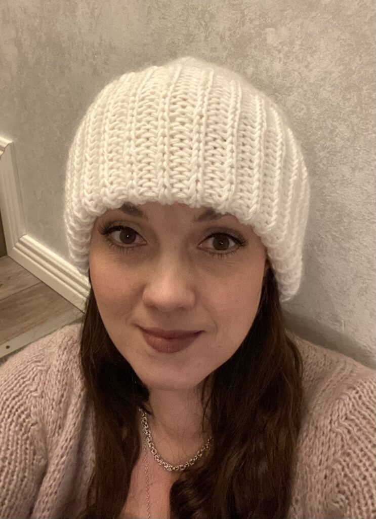 The beanie is knitted with size 7mm knitting sticks and thus very quick to complete. The first beanie was ready already next day and taken into use by its new owner. As usual, I had reserved “enough” yarn (you know how awful it is if you run out of correct dyeing patch 😱) and decided to make myself too a “Muhku”.